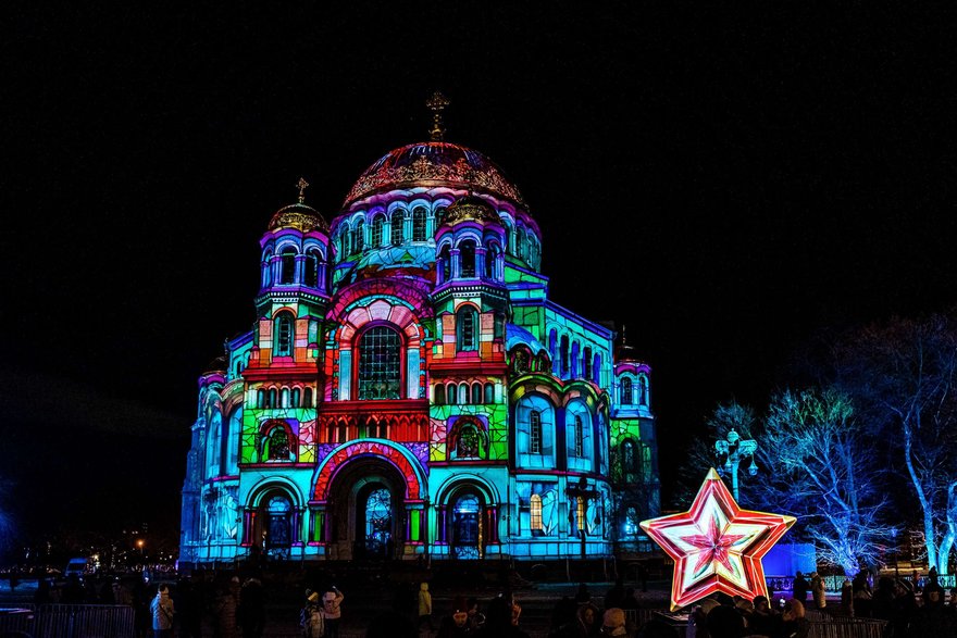 С 27 декабря по 14 января Якорная площадь в Кронштадте вновь превратится в новогодний городок. Главным элементом станет мультимедийное шоу на фасаде Никольского морского собора — яркие проекции полностью «оживят» храм, превращая его в сияющее панно из витражей, мозаики и рождественских сюжетов.