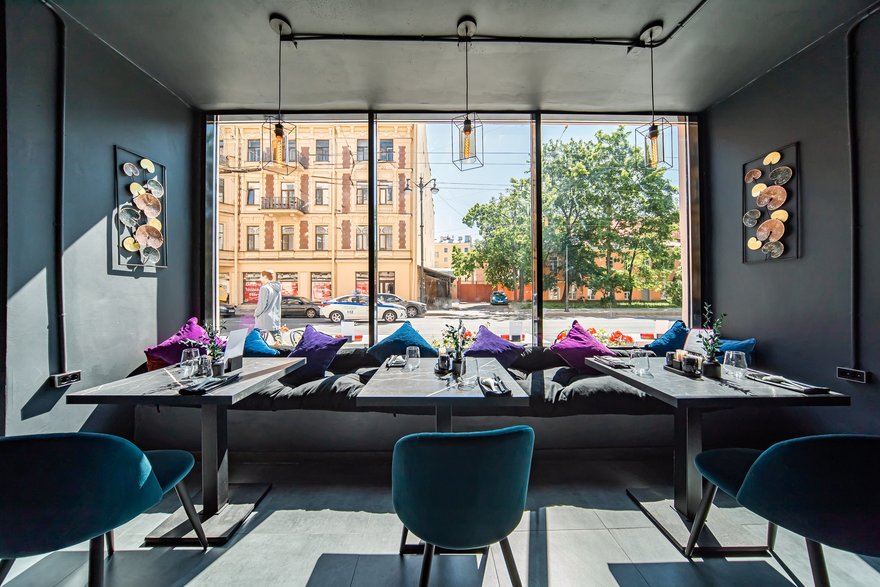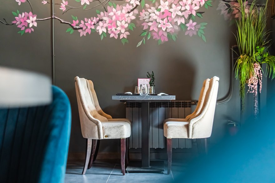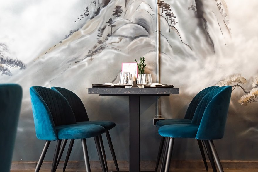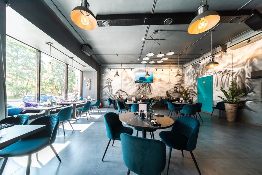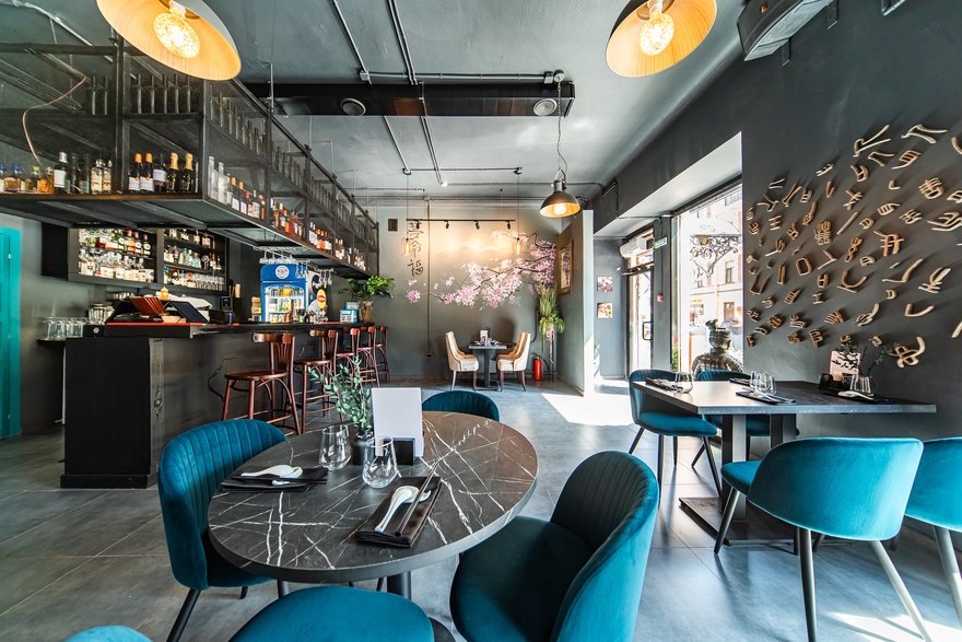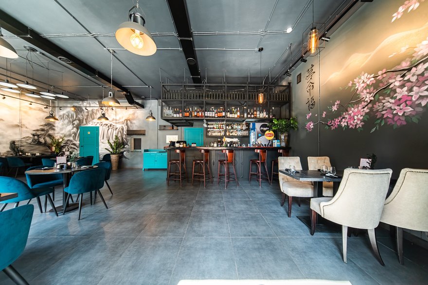 В интерьере нового заведения прослеживаются азиатские мотивы благодаря тематическому муралу и стене с иероглифами, которые в балансе с холодным оттенком пола и индустриальным потолком c дизайнерскими светильниками делают стиль пространства по-восточному минималистичным. Внушительный бар с деревянными стульями и эргономичные мягкие кресла привносят европейские нотки в общий концептуальный дизайн.