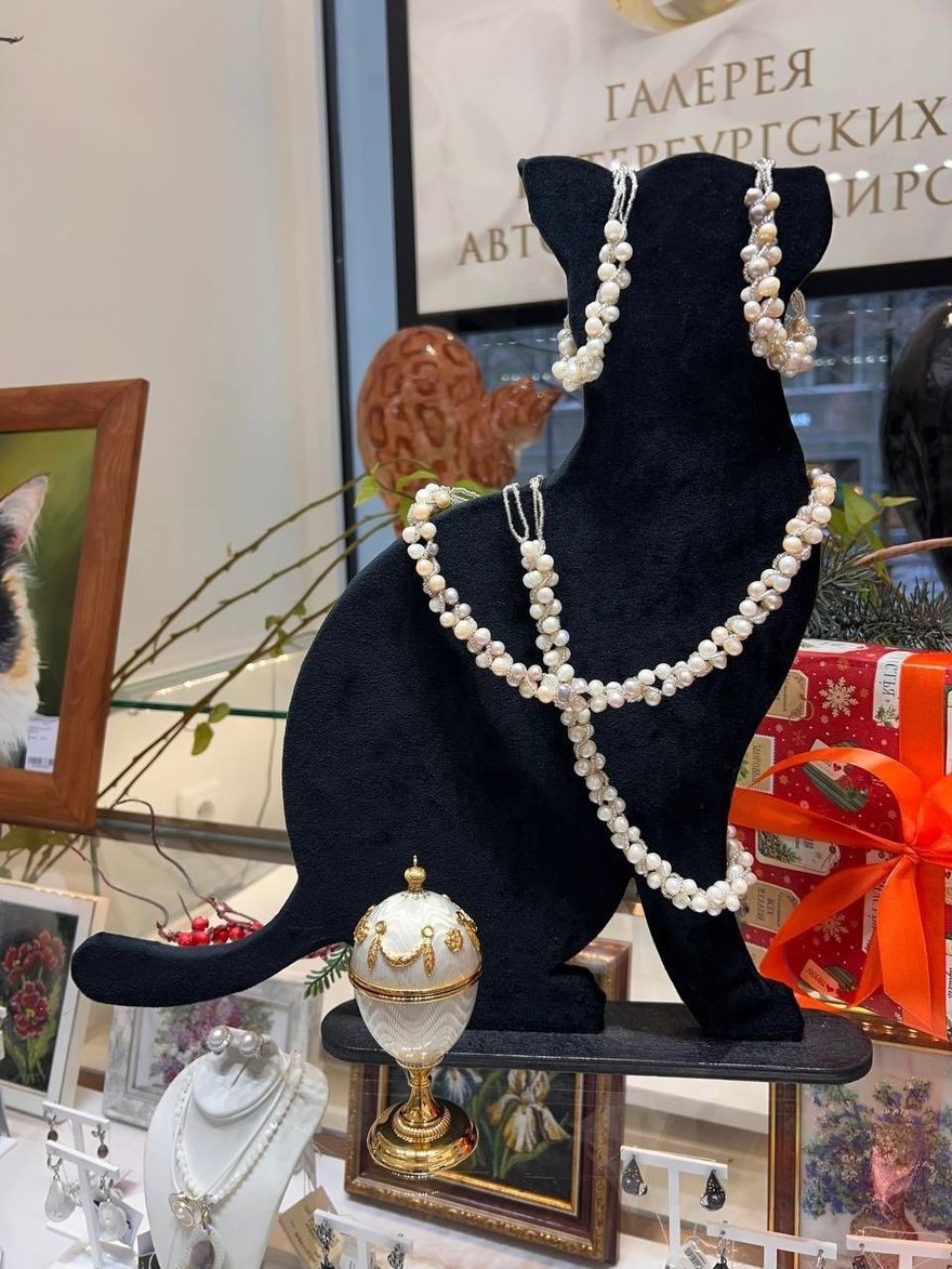 На выставке представлены украшения, картины и фигурки с изображением котов, выполненные с использованием натуральных камней. Каждый минерал подан не просто как декоративный элемент, а как часть художественной истории.