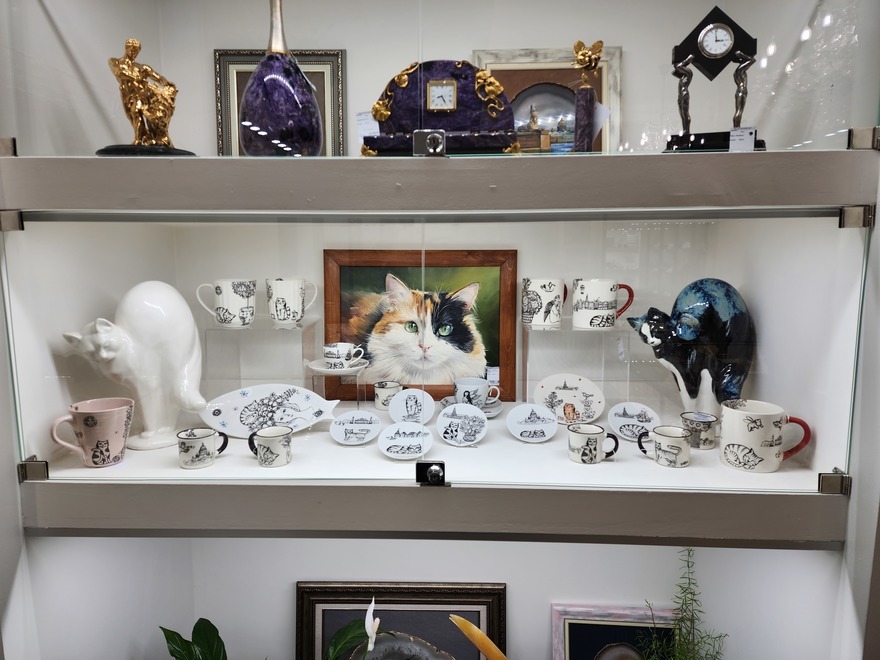 Помимо минералов, посетители могут увидеть фарфоровые и каменные статуэтки, керамику, мозаику, бронзовые изделия и ювелирные украшения. Фактически это полное собрание образов петербургских котов, созданных художниками и мастерами разных направлений.