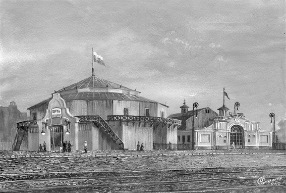 Деревянное здание кинотеатра «Колизей» было построено в 1908 году по проекту архитектора Якова Гевирца, который был известен в Петербурге своими неоклассицистскими постройками.
