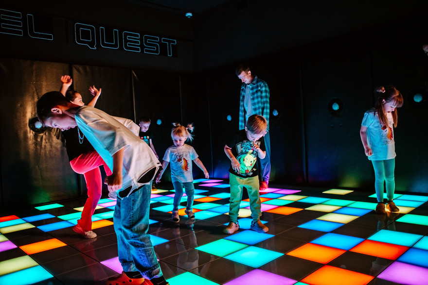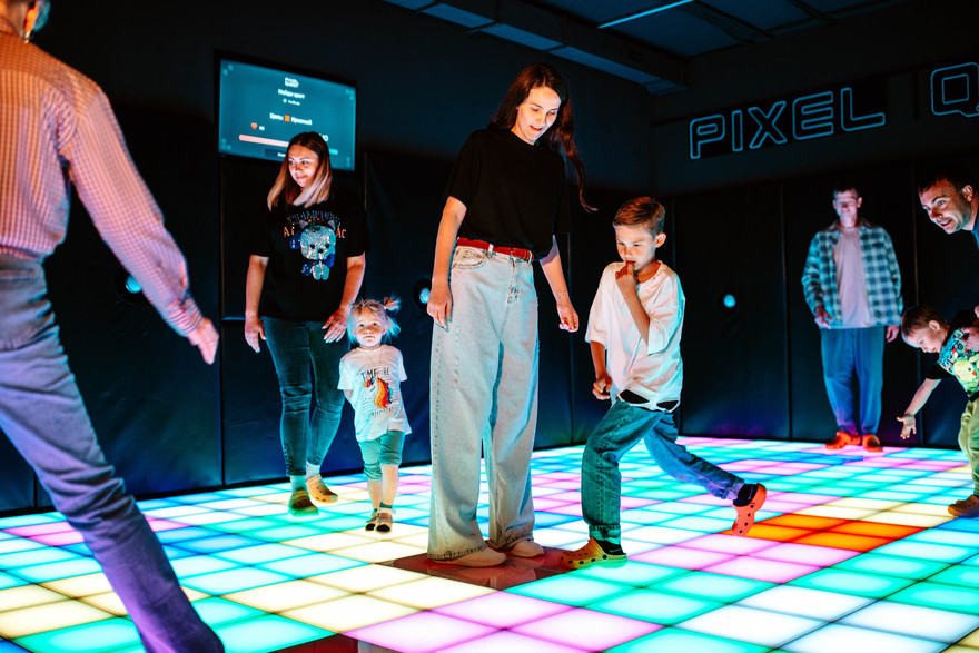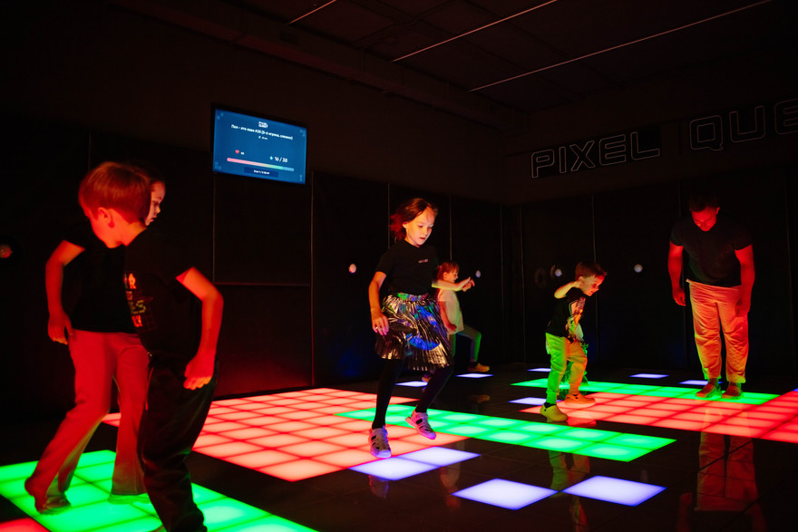 Pixel Quest — это место, где день рождения превращается в настоящее приключение. Здесь дети играют на уникальном световом полу с интерактивными кнопками: бегают, прыгают, уворачиваются и соревнуются в более чем 50 динамичных играх. В новом формате оживают знакомые развлечения вроде «Пол — это лава», «Классики» или «Море волнуется», а ещё есть командные и соревновательные сценарии, которые делают праздник ярким и активным.
