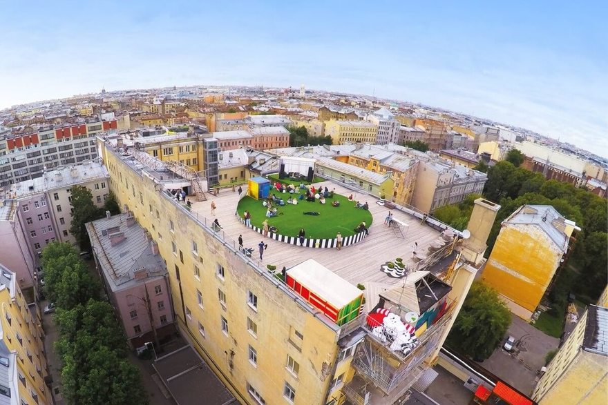 На крыше располагается целый парк со своим газоном, интерьером и уютной атмосферой. Посетители, поднявшись туда, смогут наблюдать прекрасный вид на центр культурной столицы.