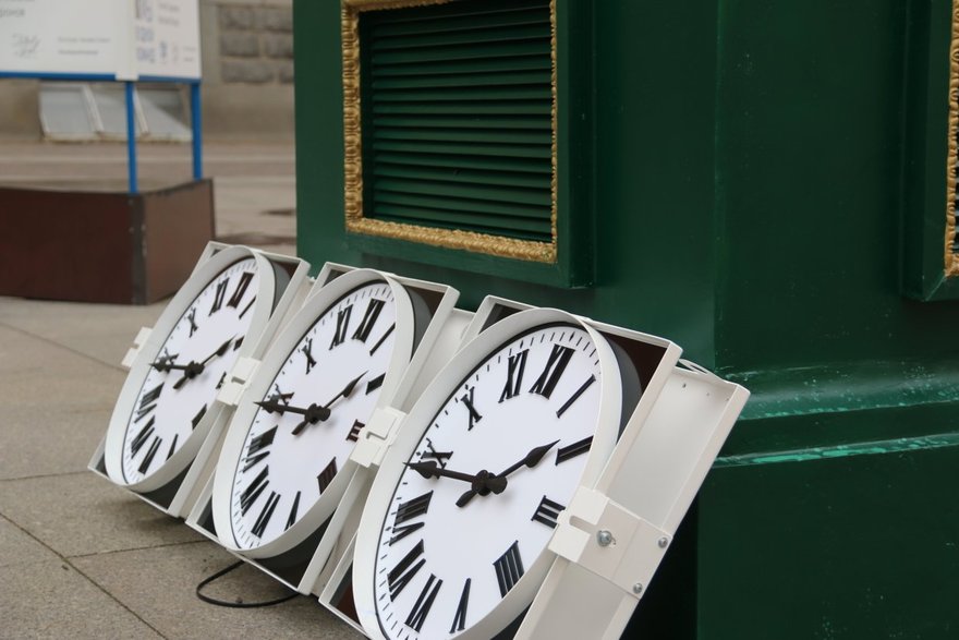 В ходе ремонта фасады сооружения очистили, загрунтовали и покрасили. А в павильоне заменили стёкла и установили новый часовой механизм.