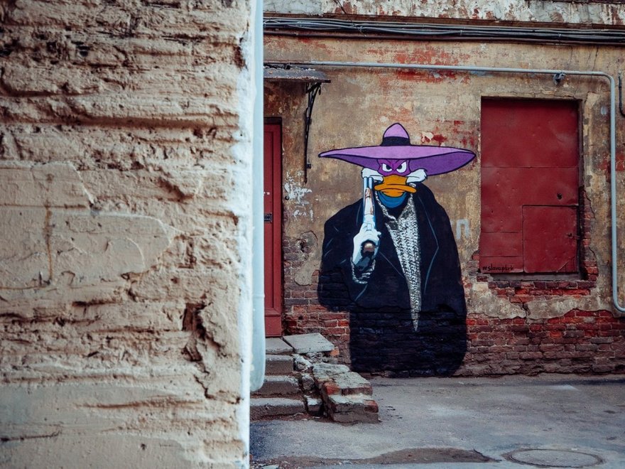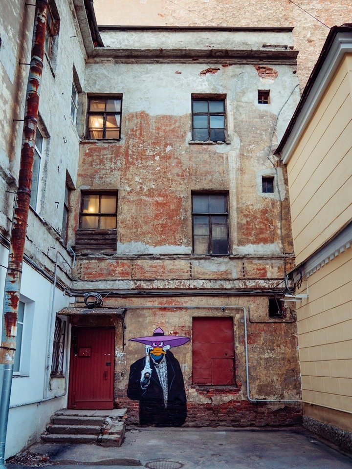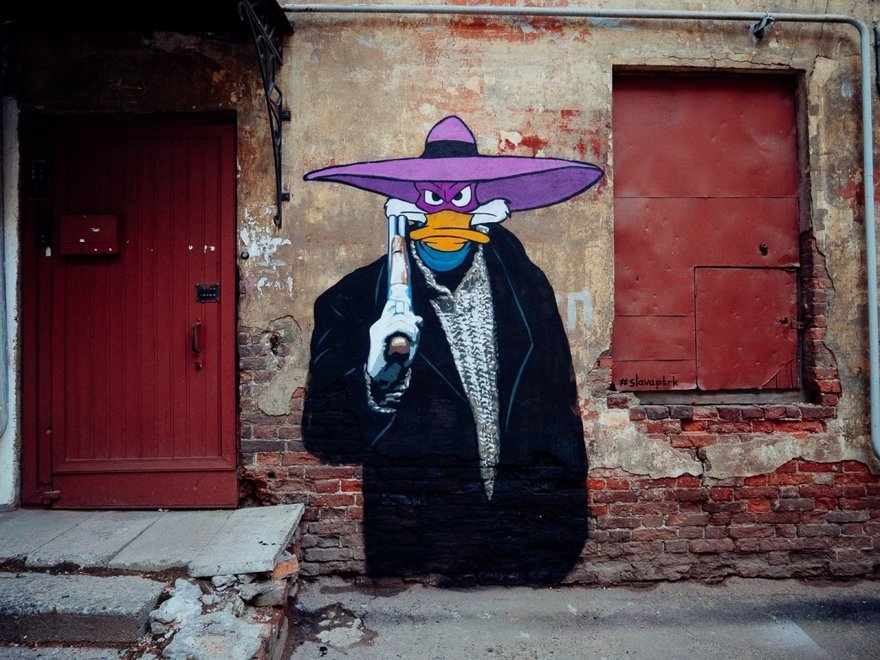 Главный герой дилогии «Брат» в образе диснеевского Чёрного Плаща граффитист стал частью серии «Детство перед телевизором», в которой ранее Слава ПТРК изобразил героев сериала «Бригада» в образе черепашек-нинздя на Уралмаше.