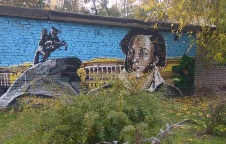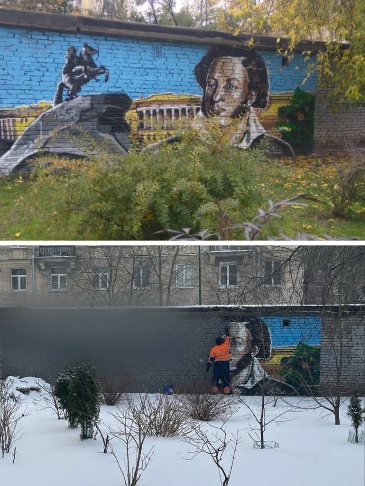 Во дворах на Школьной улице закрасили граффити с Пушкиным. В нескольких городских сообществах ВКонтакте появились фотографии, на которых видно, что коммунальщики покрывают серой краской цветное изображение поэта и «Медного всадника».
