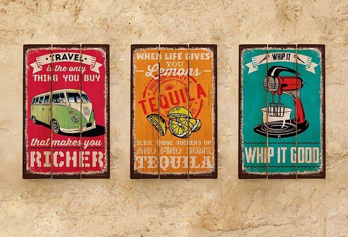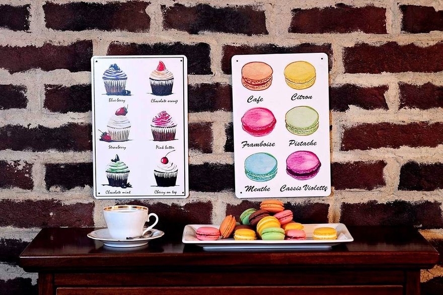 Жестяные таблички исполнены в самых разнообразных стилях: от девичьего прованса до элегантного ретро и винтажные. Найдутся жестянки с ироничными картинками и мотивирующими надписями.