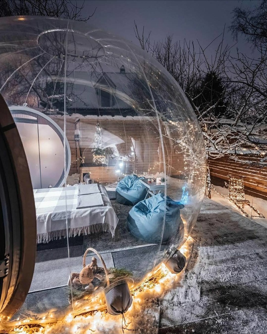 Гостевой дом Bubble Dacha похож на мыльный пузырь — он прозрачен со всех сторон, поэтому здесь можно мечтать, наблюдая звёзды, без риска замёрзнуть даже зимой — при температуре на улице до минус 8 градусов уют внутри обеспечивают тепловые пушки.