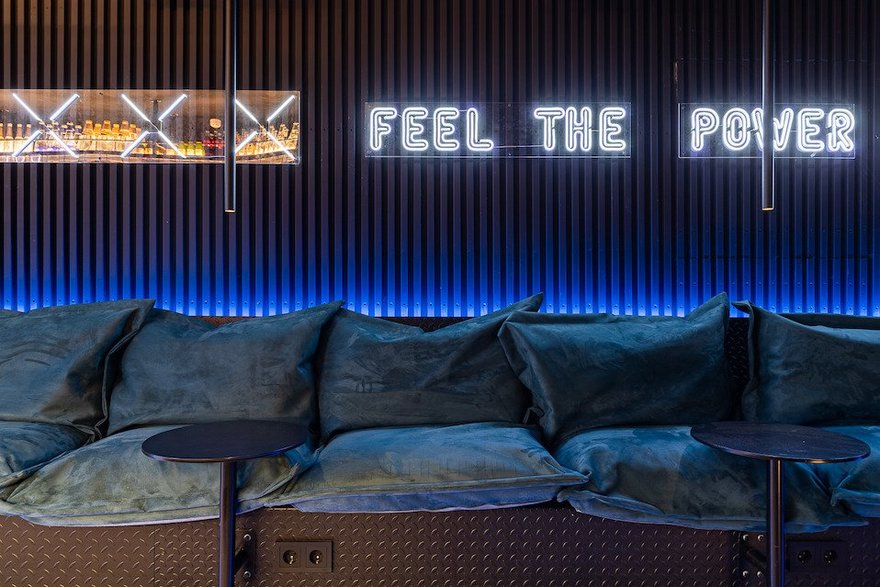 Интерьер оформили в современном стиле с элементами лофт. Темные стены гармонируют с неоновой подсветкой и металлическими деталями. Удачное зонирование залов позволяет комфортно расположиться на мягких диванах за столиками или у небольшой барной стойки.
