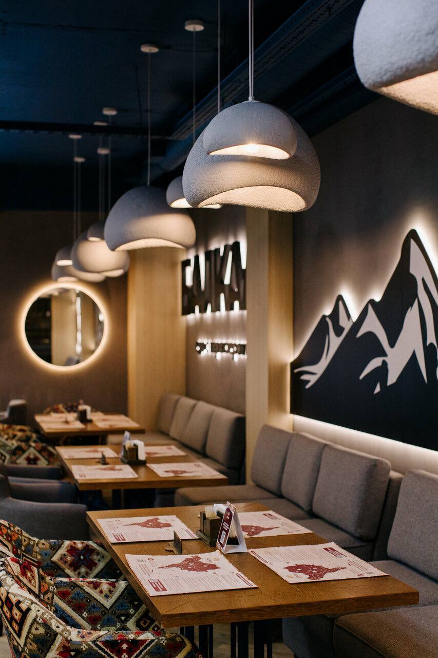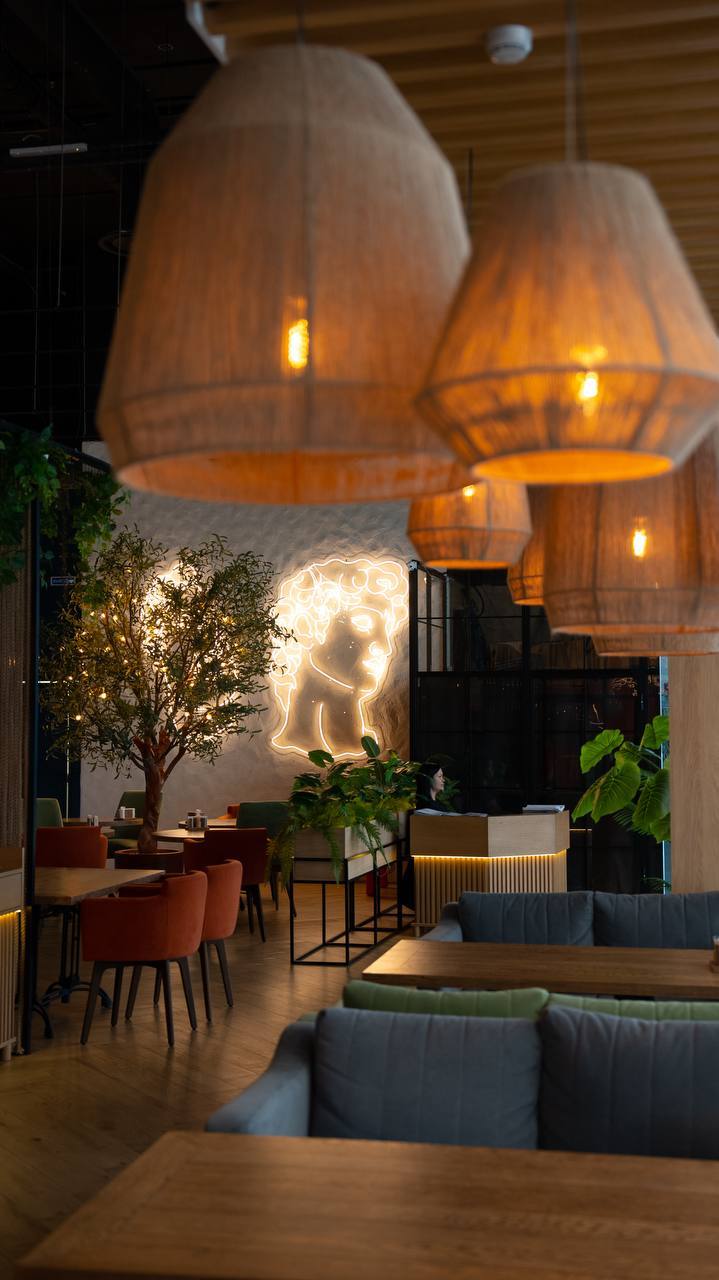 Интерьеры оформлены в национальном стиле: дерево, текстиль, элементы декора и фоновая музыка создают ощущение южного ресторана. Посетители в отзывах хвалят уютную атмосферу, мягкий свет и удобную посадку.