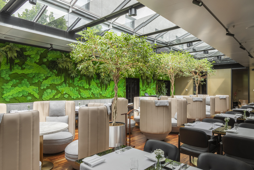 Классика здесь переплетается с модерном, а парадность гармонирует с уютом. Обилие растений отсылает посетителя к образам городских скверов, скрытых от глаз окружающих.