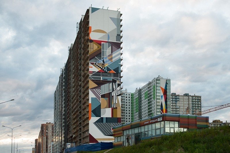 Стену одного из домов жилого комплекса «Граффити» теперь можно считать одной из неформальных достопримечательностей города на Неве: здесь художники Petro и Slak разукрасили брандмауэр яркой авангардной иллюстрацией, вздымающейся ввысь на аж 24 этажа. Это граффити совершенно точно можно назвать самым большим не только в городе, но и во всей стране. Рисунок достигает 75 метров в высоту, а общая его площадь — 1140 кв.м.